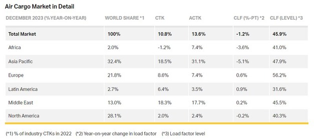 Global full-year demand in 2023, measured in cargo tonne-kilometers (CTKs), was down 1.9% compared to 2022 (-2.2% for international operations). Compared to 2019, it was down 3.6% (-3.8 for international operations).