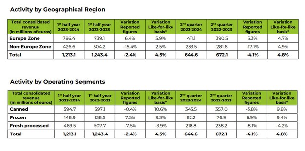 The Bonduelle Group’s revenue for the 1st half year of fiscal year 2023-2024 amounted 1,213.1 million euros compared with 1,243.4 million euros for the 1st half of previous fiscal year, up +4.5% on a like-for-like basis* and down -2.4% on reported figures.