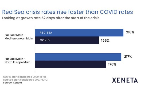 "Rates have not hit anywhere near the levels we saw during Covid-19, but the sudden nature of the Red Sea crisis has seen a more rapid increase in rates, which is arguably creating even more disruption than during the early months of the pandemic," stated Emily Stausbøll, market analyst at Xeneta.