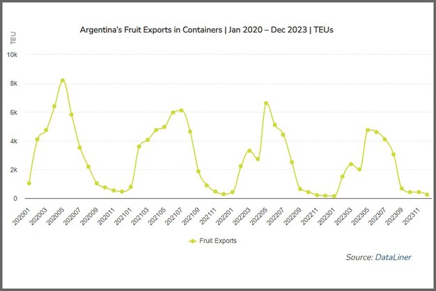 The chart below shows the month-on-month progression of fruit exports in containers from Argentina between Jan 2020 and Dec 2023. The data is from Datamar’s maritime intelligence service DataLiner.