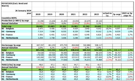 The global harvest was 22,7 million tonnes, 5,1 % up vs 2022 and nearly equal to the 5 years average. These figures include the estimated in field losses in the NEPG countries. Potatoes were produced on a total area of 519.583 ha, 2,0 % up from 2022. Average stored yields in the NEPG zone were of 43,7 t/ha, 1,4 % higher than 2022.