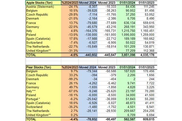 Total European apple stock are down by 4.6% when compare to the same time last year. The biggest drops come from the UK at -31.3% followed by the Czech Republic at -29% and The Netherlands at -22.7%. Gains were made in Spain at +17.8%, France +13.7 and Belgium +10.5%.