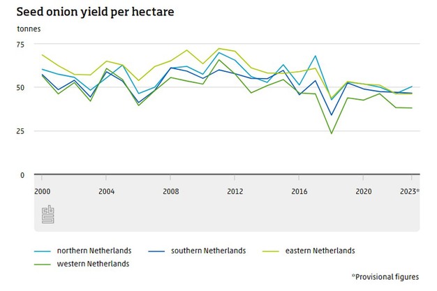 In the west of the Netherlands, the gross yield per hectare for seed onions has been structurally lower than in the other parts of the country in recent years. This is mainly attributable to the situation in the province of Zeeland, where due to soil salinisation and a lack of fresh water for irrigation, it is becoming increasingly difficult to achieve high yields per hectare.