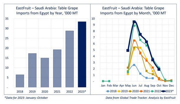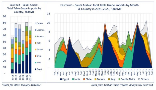 Egypt has also been one of the fastest-growing suppliers of table grapes to Saudi Arabia. In 2018, it accounted for only 11% of the country’s total imports, but by 2022, it reached 36%. In January-October 2023, Egypt’s share was 45%, but it is expected to drop by the end of the year, as the Egyptian export season is almost over.