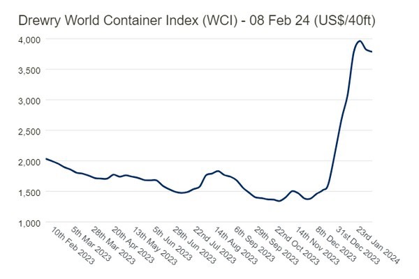 The latest Drewry WCI composite index of $3,786 per 40ft container is 167% more than average 2019 (pre-pandemic) rates of $1,420. The average composite index for the year-to-date is $3,515 per 40ft container, which is $829 higher than the 10-year average rate of $2,686 (which was inflated by the exceptional 2020-22 Covid period).
