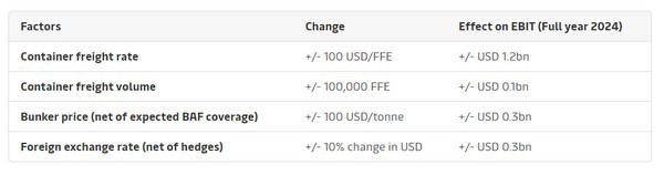 Guidance is based on the expectation that global container volume growth in 2024 will be in the range of 2.5% to 4.5% and that Maersk will grow in line with the market. It is further expected that the significant oversupply challenges in the Ocean industry will materialise fully over the course of 2024. High uncertainty remains around the duration and degree of the Red Sea disruption with the duration from one quarter to full year reflected in the guidance range. Front-loading is expected towards the start of 2024.