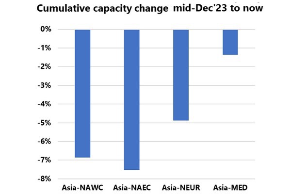 What this shows is that despite the extreme upheaval in the vessel schedules, the capacity offered from Asia to Europe has only been reduced quite marginally because of the Red Sea crisis. The capacity reduction here measured is not measured Y/Y, but of the planned schedules in mid-December versus what has materialised until now. Curiously, as shown in Figure 1, the impact on the Transpacific is larger, and it is particularly interesting to see the capacity drawdown on Asia-North America West Coast.