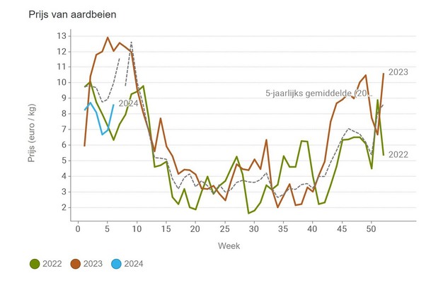 The positive exception amid generally declining prices is strawberries. Their median price has found its way upward again. In line with the five-year average, the price in week 6 rose to just over €8.61.