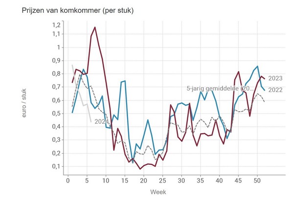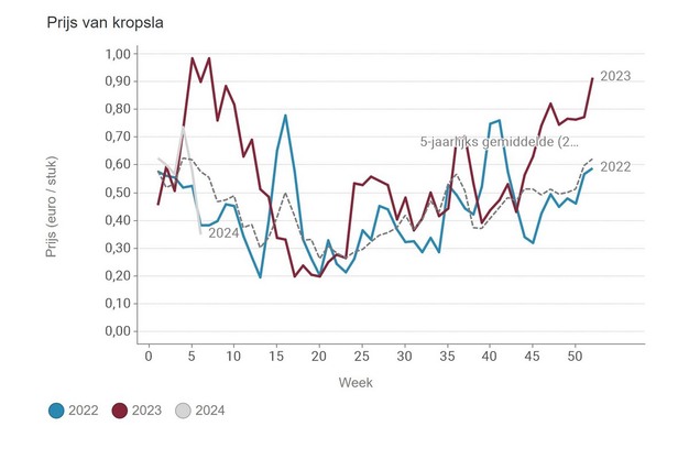 The median price for a cucumber was €0.435 in week 6, while lettuce prices also fell. The price per head of lettuce was €0.35. For other greenhouse varieties, only Lollo Rossa's median price rebounded to an average of €1.29 per piece.