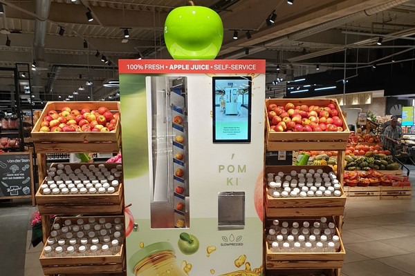 While fresh orange juice can now be pressed on-site at numerous retail markets, the pressing of apples at the point-of-sale is still in its infancy. The Düsseldorf-based company Kaffee Anders Handels Ltd aims to change this with a slow juicing process named Pomki for use in retail. The sophisticated process is designed to strengthen local fruit farming and minimize waste, the company reports.