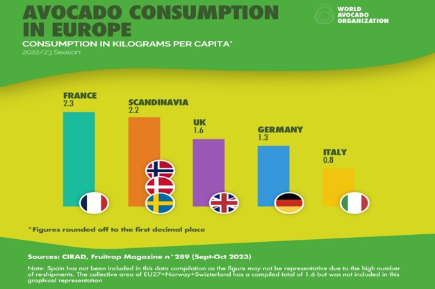 The World Avocado Organization (WAO) latest data from the 2022/23 season reveals which European markets are the biggest consumers of avocados. Up from last year, the UK joins Germany in second place each boasting around 110,000 tonnes. However, leading the love for avocados is France, where an impressive 150,000 tonnes were shipped during the 2022/23 season.