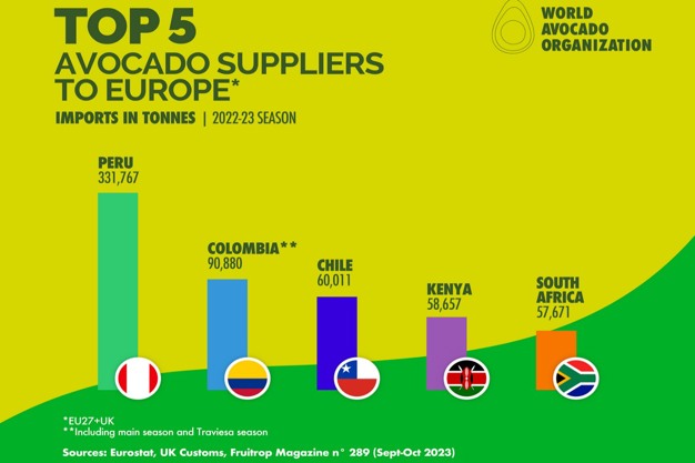 demand of rumbling bellies craving this versatile and nutritious fruit. Peru is the biggest supplier of avocados to Europe, with a staggering 331,767 tonnes arriving in the 2022/23 season (in contrast, only 38,000 tonnes came from Mexico). Colombia came in second place with 90,880 tonnes, followed by Chile at 60,011 tonnes, Kenya at 58,657 tonnes, and South Africa in fifth place at 57,671 tonnes.