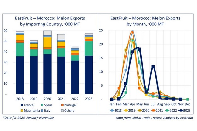 France was the dominant destination for Moroccan melons, accounting for almost two-thirds of the total exports from Morocco. The exports to France rose by 15% to 36 thousand tons in January-November of last year.