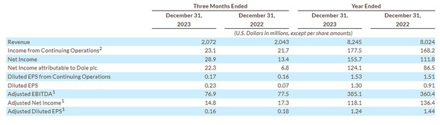 Dole plc today released its financial results for the three months and year ended December 31, 2023.