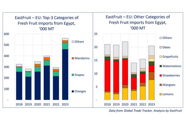 According to EastFruit, Egyptian fresh fruit exporters, who target the EU market, had a very successful year in 2023. They managed to almost double their export volume, reaching over half a million tons for the first time ever!