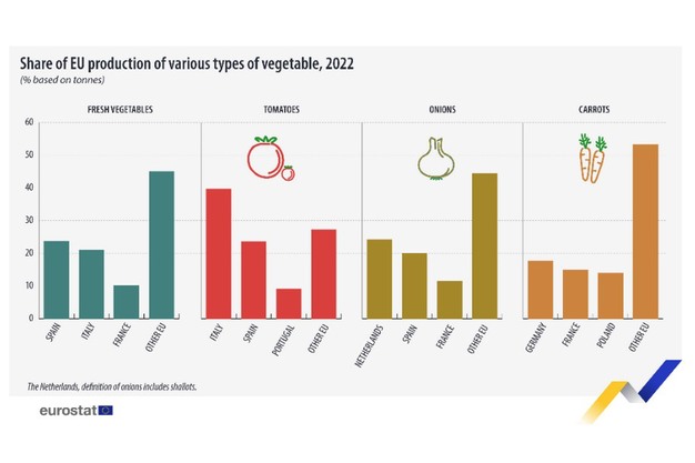 The Netherlands was the leading onion producer, with nearly one quarter (24%) of the EU's harvested onions, ahead of Spain (20%) and France (12%). Top producers of carrots were Germany (18% of the EU total), France (15%) and Poland (14%).