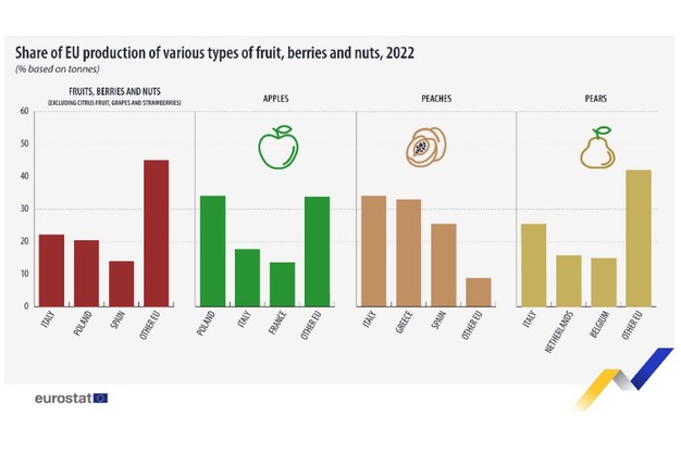 Italy, Poland, Spain, and France were the main producers of fruit, berries, and nuts (excluding citrus fruit, grapes, and strawberries) in the EU, although for some specific fruits, other EU Member States were also key producers.