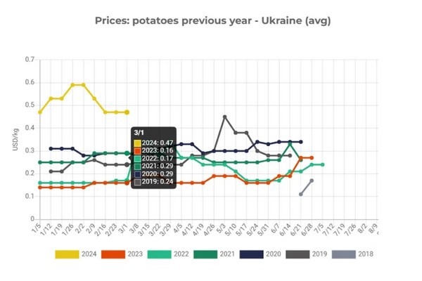 Market players observe that the supply of high-quality potatoes in Ukrainian farms is dwindling, while the demand for this product is rising. This is the main driver of the price hike. It should be noted that farmers are also able to charge more for lower quality products in these circumstances. Moreover, potatoes in Ukraine are now on average 2.8 times more expensive than in early March 2023. Market operators expect that the prices will keep going up, as the potato supply keeps going down.