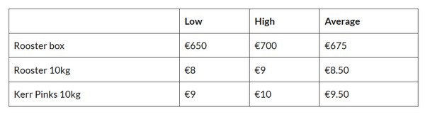 Markets remain unchanged this week with consumption and sales holding steady. Continued wet weather has resulted in no opportunity to plant early crops. Little if any earlies have been planted even along the coast. The weather conditions also means that there is no opportunity to lift any unharvested crop. Stocks are increasing tight with upwards price pressure.