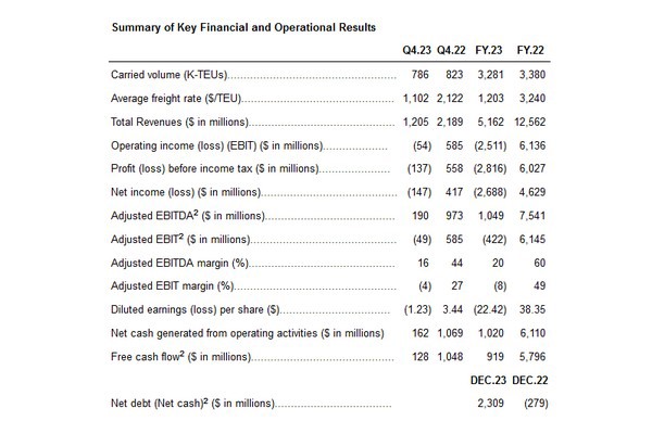 ZIM Integrated Shipping Services Ltd., a global container liner shipping company, announced today its consolidated results for the three and twelve months ended December 31, 2023.