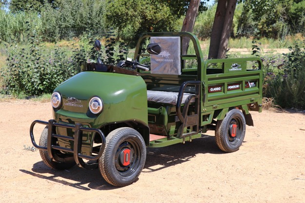 The LEKKEWAAN has a bigger 1,200 Watt motor, manual low-range transmission, and more battery power (five 12V batteries delivering 52 Ampère hour) than the three-wheeler, with excellent stability in navigating uneven terrain.