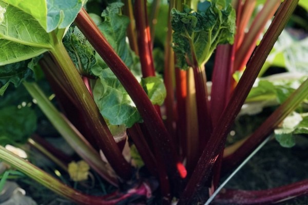 Freshly harvested rhubarb. A portion of the yield is processed into rhubarb juice as well.
