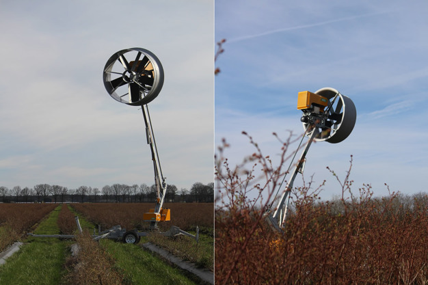 "Our mobile wind machine uses the Venturi effect to pull warm air down from the higher inversion layer, mixing it with the cold air at ground level. That happens after the machine's wind force breaks through the ground-level cold inversion. Hundreds of machines now operate worldwide, and users love their mobility, ease of use, and efficiency. It's simply the smartest solution against frost. The early spring means we produced extra machines, some of which are still available for immediate delivery. Nature is two to three weeks ahead of last year, and May 11th is still a long way off."