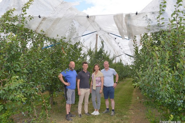 Last year, Frutania announced the acquisition of the neighboring fruit farm Krupp and the plum variety Haroma from protected cultivation. From left to right: Plum producer Martin Krupp (now a member of the Supply Chain), Tobias Linnemannstöns (Head of Supply Chain), and Béatrice and Markus Schneider.