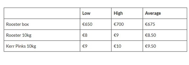 The current weather crisis is causing huge concern for Irish potato growers. Planting of early crops has been extremely limited, and the forecast is for continued unsettled weather. With the current shortage of main season crop, this extreme weather will worsen the situation. Consumption remains buoyant as hearty meals continue to be a feature in households.