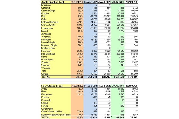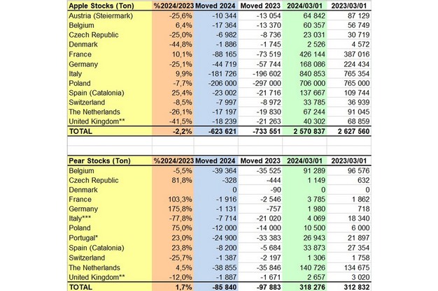 WAPA, the World Apple and Pear Association, released the apple and pear stock figures for 1 March 2024. The figures show that in Europe apple stocks decreased by -2.2% compared to 2023 to reach -623 621 T, while pear stocks increased to 1.7% to reach 85 840 T. In the USA, apple stocks as of 1 March 2024 stood at 265 219 T (35% higher compared to 2023), with pear stocks also higher at 36 433 T (16.5% more than 2023).