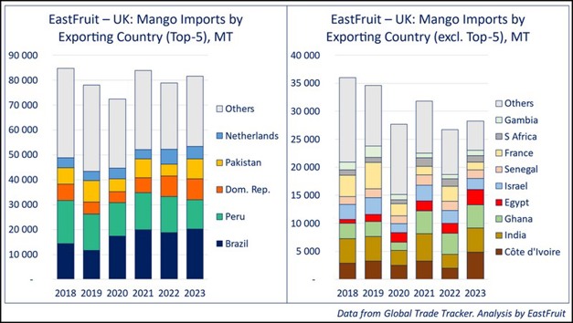 Brazil, Peru, the Dominican Republic, Pakistan, and the Netherlands lead as the top five mango suppliers to the UK, jointly contributing to approximately two-thirds of the market's annual supply. Egyptian mangoes primarily rival Brazilian offerings, with Brazil's peak season spanning September to December. Conversely, Peruvian mangoes and guavas grace the UK market from December to April, while the Dominican Republic and Pakistan supply from May to August.