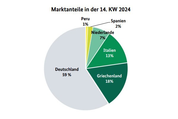 The presence of domestic asparagus expanded. For white and violet varieties, there was mainly access to Greek, Dutch, and Italian deliveries. For green spears, besides the domestic batches, there were primarily Spanish, Italian, and Dutch ones. The early harvested products were often sent to the market by Bruchsal for marketing. According to BLE, imports from Mexico and Peru only played a minor role and had lost significance.