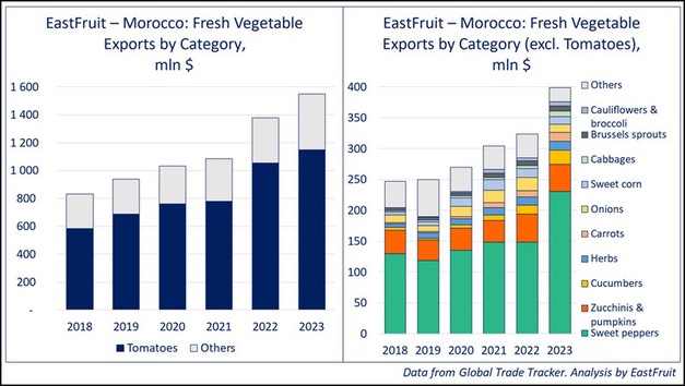 Throughout 2023, Morocco demonstrated a robust increase in its export earnings within the fresh vegetable sector, even as the physical volume of exports declined. EastFruit's analysis reveals that vegetable exports netted the nation nearly $1.6 billion – a 12% surge from the previous year and a figure nearly 50% higher than the five-year average. Despite adverse weather events leading to a 14% drop in the tonnage of Moroccan fresh vegetable exports to 1.06 million tons, this figure still represents a 5% increase over the past five-year average.