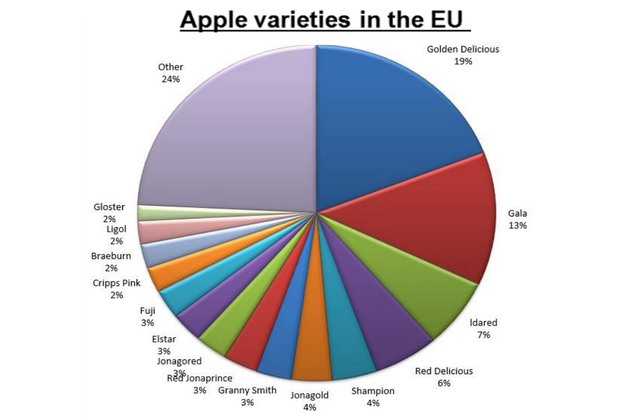 EU apple production forecasts are highest for the Golden Delicious variety, at 2,168,000 tons, with Gala coming in at 1,527,000 tons.