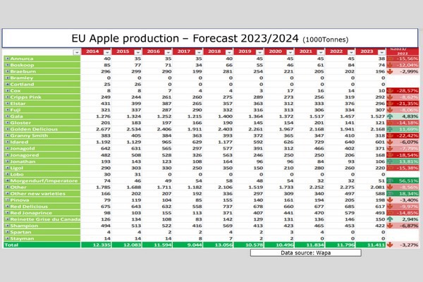 EU apple production forecasts are highest for the Golden Delicious variety, at 2,168,000 tons, with Gala coming in at 1,527,000 tons.