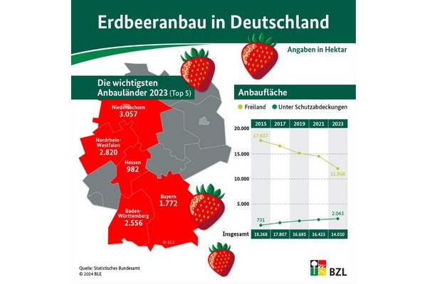 Conversely, cultivation under protective covers has seen an increase (+1,312 hectares compared to 2015). Here, yields per hectare are nearly twice as high as those in open fields. The leading strawberry-producing regions are Lower Saxony, North Rhine-Westphalia, and Baden-Württemberg, with these three states accounting for around 60 percent of the total cultivation area.