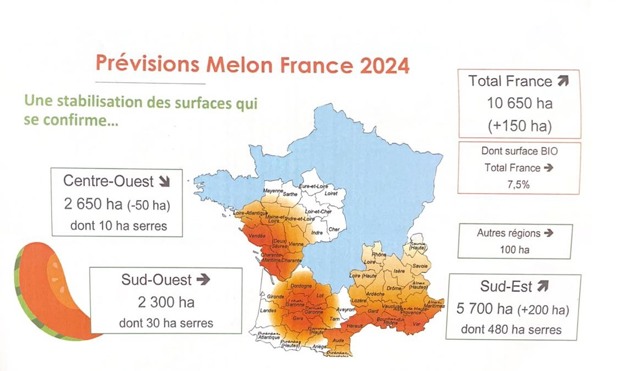 For the second year, acreage has stabilized in France, with a total of 10,650 hectares (slightly up by 150 hectares). But the Interprofessional Melon Association warns that "this stabilization does not mean that the 2024 campaign will be better or worse than last year's. Indeed, 2022 and 2023 were totally different years in terms of volumes and marketing," says Myriam Martineau.