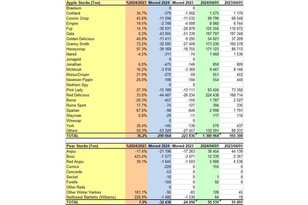 In the USA, apple stocks as of 1 April 2024 stood at 290 664 T (36.2% higher compared to 2023), with pear stocks also higher at 32 438 T (7.9% more than 2023). The apple stocks of Fuji was up with 14.1%, Gala is 0.2% higher and Golden Delicious is up by 46.8%, while Granny Smith is 72.2% higher.