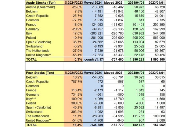WAPA, the World Apple and Pear Association, released the apple and pear stock figures for 1 April 2024. The figures show that in Europe apple stocks increased slightly by 0.3% compared to 2023 to reach -674616 T, while pear stocks increased with 16.3% to reach 135 589 T. In the USA, apple stocks as of 1 April 2024 stood at 290 664 T (36.2% higher compared to 2023), with pear stocks also higher at 32 438 T (7.9% more than 2023).