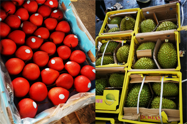 Left: New Zealand red pears; Right: Vietnam Kanyao durians.