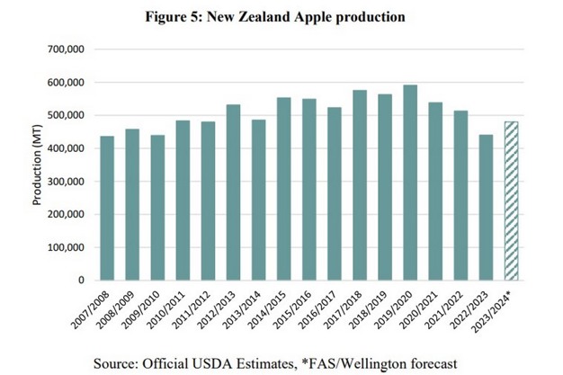 New Zealand's apple planted area in the 2023/2024 market year (MY) is forecast to be 9,200 hectares (ha), a substantial drop from 11,000 ha at the start of the 2022/2023 MY. This is due to the impacts of Cyclone Gabrielle, which brought large-scale floodwaters, silt, debris, wind, and surface flooding to the primary apple growing regions of Hawkes Bay and Gisborne. Orchards in this region were damaged so severely that tree stocks were not viable for future production or were destroyed completely. FAS/Wellington is forecasting apple production in the 2023/2024 MY to be 480,000 metric tons (MT).