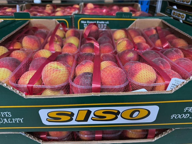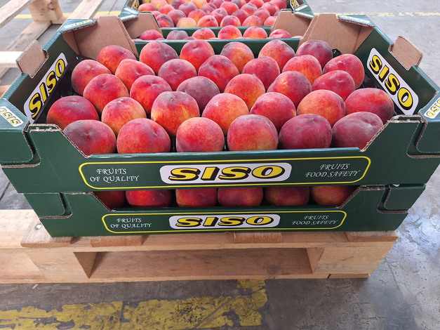 "With the peaches, we have just started from the northern part, in the Zaragoza region. This supply consists mostly of smaller sizes, laid in a single layer. Now, slowly, more larger peaches are coming onto the market. The prices fluctuate considerably on a daily basis, so it's a bit of moving with the market. Prices for the small sizes are around 5-5.50 euros, while the price for the larger sizes goes up to 8-9 euros."