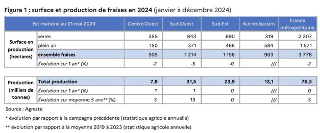 "French strawberry surface areas for the 2024 campaign is forecast at 3,778 hectares, which is 2% lower than last year. The drop from 2023 is more marked in southwestern France, due to a reduction of open-ground areas and a shift towards greenhouse production. French strawberry production, estimated at 76.3 million tons, is similar to last year's and 5% higher than the five-year average.