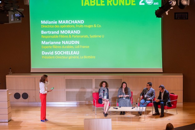 Highlight of the day: a round table discussion moderated by Muriel Lapalu, entitled: "CSR among retailers and producers: an absolute or secondary requirement?," with the presence of Marianne Naudin, sustainable supply chain expert at Lidl France, Bertrand Morand, head of supply chain and agricultural partnerships at Système U, Mélanie Marchand, director of operations at Fruits Rouges & Co. and David Socheleau, managing director of La Blottière.