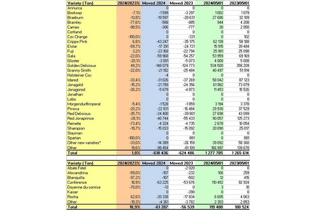 In the USA, apple stocks as of 1 May 2024 stood at 283 598 T (32.9% higher compared to 2023), while pear stocks are lower at 27 999 T (9.4% less than 2023). The apples stock of Fuji was up with 13.5%, Gala is -2.9% lower and Golden Delicious is up by 37.2%, while Granny Smith is 72.4% higher.