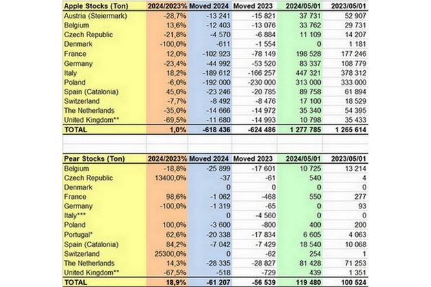 WAPA, the World Apple and Pear Association, released the apple and pear stock figures for 1 May 2024. The figures show that in Europe apple stocks increased by 1% compared to 2023 to reach 618 436 T, while pear stocks increased by 18.9% to reach 61 207 T. In the USA, apple stocks as of 1 May 2024 stood at 283 598 T (32.9% higher compared to 2023), with lower pear stocks at 27 999 T (9.4% less than 2023).