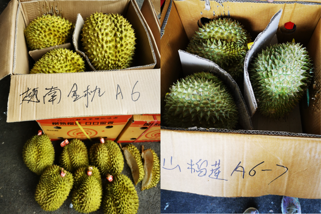 Left: Vietnamese Monthong durians; Right: Thai Volcano durians.