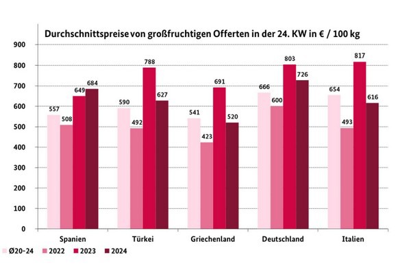 According to the BLE, Spanish offers dominated the market. They played a particularly important role in Berlin, where fruit in size 32 mm+ cost around €8 per kg. In Hamburg and Cologne, their presence had expanded noticeably, which is why they were cheaper. In Frankfurt, their quality was not entirely convincing, which is why customers increasingly turned to Turkish imports. These arrived in Munich in greater numbers, which is why prices crumbled a little and were popular with buyers despite comparatively high valuations.