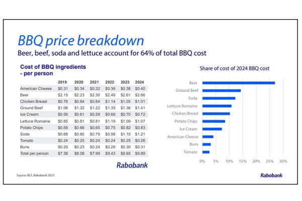 This is the last year a 10-person barbecue for the 4th of July will cost less than $100. That was just one key conclusion taken from the annual Rabobank BBQ Index presented this week in which more than 80 North American analysts contributed to insights on food pricing–from dairy to beverages to protein and of course, produce.