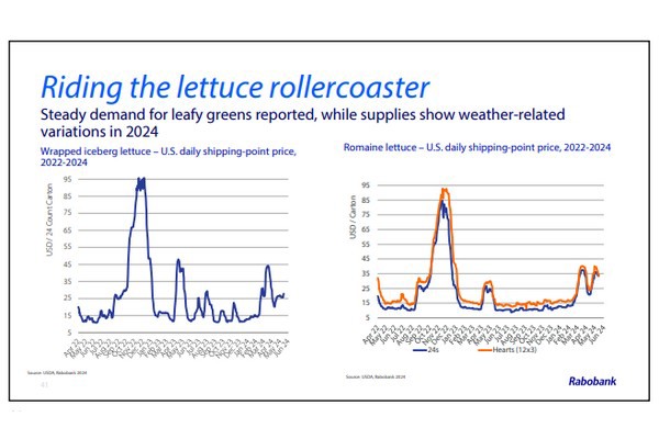 Lettuce: A volatile market given its susceptibility to weather shocks that impact prices, lettuce pricing by the end of 2022 was unusually high given a combination of supply-side factors. "More recently we've seen volatility given the transition of the season during the spring. Growing conditions in key areas such as the Central Coast in California were still cold and now we are likely to see some heat waves, even in Salinas," says Magaña.